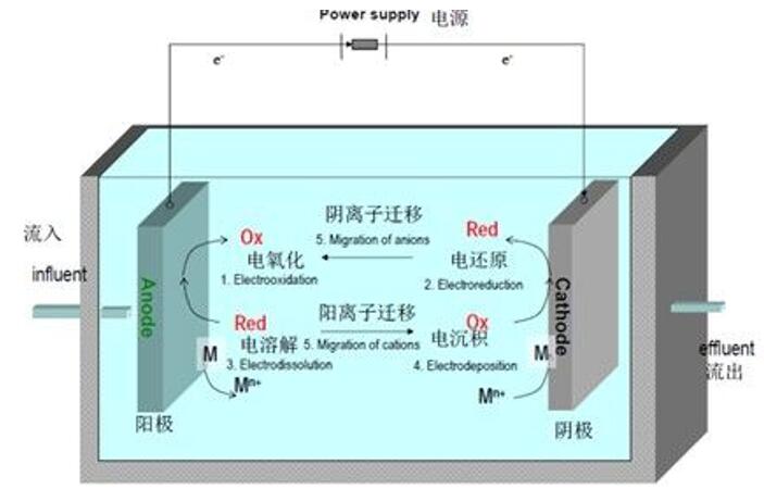 常溫常壓下,通過在極板上施加一定的電壓,水中的污染物在電極上發(fā)生直接電化學(xué)反應(yīng)或利用電極表面產(chǎn)生的強(qiáng)氧化性活性物質(zhì)使污染物發(fā)生氧化還原反應(yīng),從而破壞水中的有機(jī)物顯色基團(tuán)以及復(fù)雜的分子鏈(如絡(luò)合鏈和鰲合鏈),使其分解為小分子有機(jī)物或離子;氨氮、有機(jī)物轉(zhuǎn)成氮?dú)夂投趸肌?nbsp;