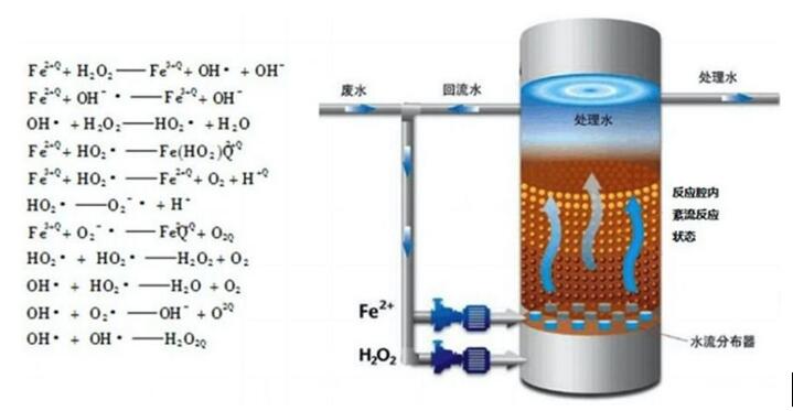 芬頓氧化法是H2O2在Fe2+存在下生成強(qiáng)氧化能力的羥基自由基·OH,并引發(fā)更多的其他活性氧,以實(shí)現(xiàn)對(duì)有機(jī)物的降解,其氧化過程為鏈?zhǔn)椒磻?yīng)。其中以·OH產(chǎn)生為鏈的開始,而其他活性氧和反應(yīng)中間體構(gòu)成了鏈的節(jié)點(diǎn),各活性氧被消耗,反應(yīng)鏈終止。其反應(yīng)機(jī)理較為復(fù)雜,這些活性氧僅供有機(jī)分子并使其礦化為CO2和H2O等無機(jī)物。從而使Fenton氧化法成為重要的高級(jí)氧化技術(shù)之一。
